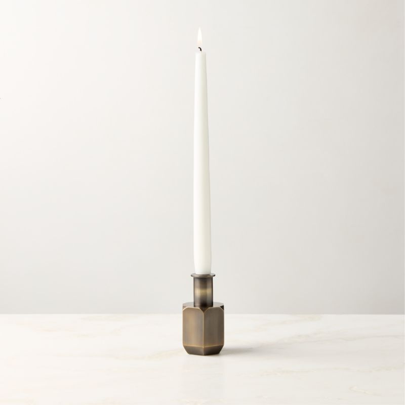 goop captures a softened industrial look through sculptural details. The distinctive forms are cast in solid unlacquered brass, offering a living finish that will continue to develop the patina of a vintage find. Designed in four different heights, the weighty taper holder is best when grouped in multiples on a table or mantel to add height. CB2 exclusive.