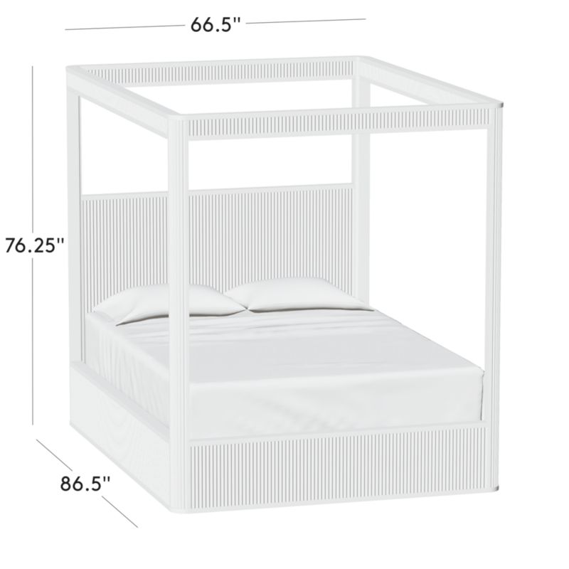 Studio ANANSI features carved fluting that wraps continuously around the frame—extending even within the headboard for a fully finished, thoughtful detail. The canopy is raised by four striking demi-lune shaped posts with fluting reminiscent of crown molding. Finished in a warm, light brown stain, the Forest Stewardship Council® (FSC)-certified pine showcases its natural character, celebrating the material's inherent subtle knots and grain variations. CB2 exclusive.