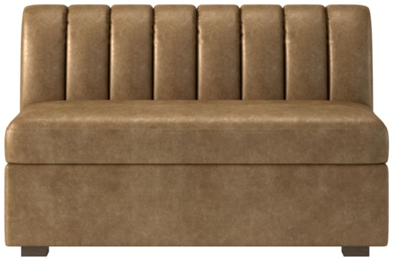 Mermelada Estudio brings sculptural presence to the dining space. Vertical channel tufting adds depth to the backrest, while the streamlined form is equally suited to wall placement or open floor plans. Upholstered in bonded leather, it offers a smooth, durable surface that's easy to care for. Solid red oak legs, certified sustainable by the Forest Stewardship Council® (FSC), are finished in a warm mid-tone stain to ground the piece with natural character. Pieces from the Duncan collection are available individually or in multiples to create a custom banquette configuration. CB2 exclusive.