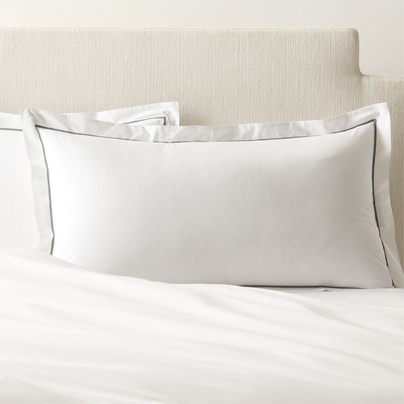 Woven from 100% certified organic cotton percale, white standard pillow shams pair the soft, supple hand of cotton with classic hotel-style details. Tailored faded teal stitching and a crisp flanged edge lend an understated elegance. Pair with matching duvet cover. CB2 exclusive.