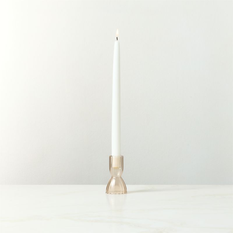 Glass taper candle holder by French industrial designer Aurélien Barbry is defined by its elegant silhouette. Featuring ribbed glass sprayed with a neutral beige tint, each candle holder casts a warm glow, glimmering like the flame within. CB2 exclusive.