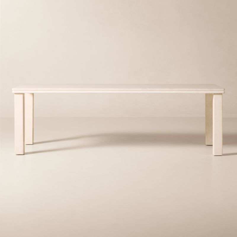 Modern rectangular dining table by Chicago-based designer Kara Mann brings a slight industrial look to the outdoors. Crafted of durable concrete that evokes the timeless beauty of limestone, the expansive top is balanced by softly rounded corners. CB2 exclusive.