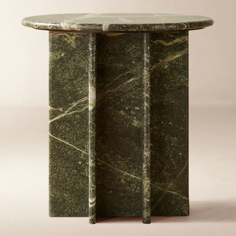 Crafted with highly active forest green marble, side table by Melbourne-based VUUE incorporates geometric design elements for a stunning silhouette. The marble's dynamic veining and striking tones of moss and cream give it mesmerizing allure, and the variation inherent to natural stone ensures that no two tables will be alike. CB2 exclusive.