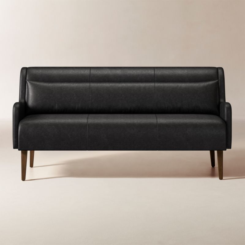 Dining bench by Sam Baron pairs sculptural form with tactile warmth. Upholstered in smooth top grain buffalo leather, it features subtly rolled arms and a high, gently reclined back that invites longer meals and lingering conversation. A down-blend lumbar pillow adds relaxed support while balancing the bench's tailored profile. Conical legs, crafted from solid rubberwood certified sustainable by the Forest Stewardship Council® (FSC) and finished in a dark brown stain, ground the silhouette with quiet sophistication. Seats up to three. CB2 exclusive.