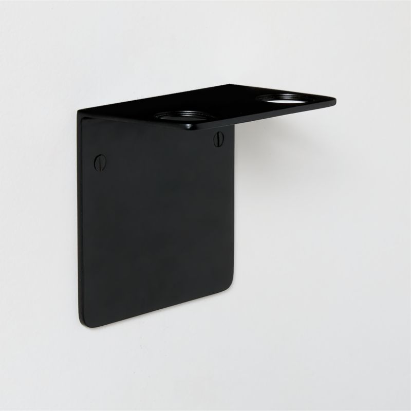 Double bottle bracket by Jannis Ellenberger is crafted of solid cast brass with a matte black powdercoat for an elegant look. Designed to accommodate two standard-size soap pumps, the wall-mounted holder keeps counters clear in the powder room. CB2 exclusive.