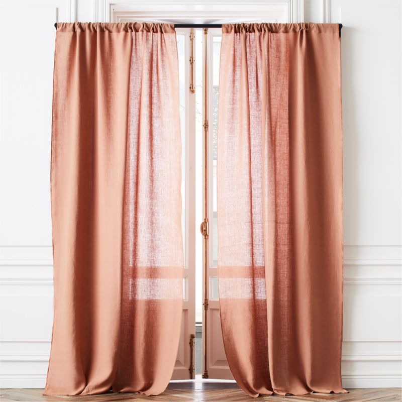 100% pure linen effortlessly filters light with a sienna hue. Curtain panel flows long to the floor and hems easily from overlock stitching at the edge. CB2 exclusive.
