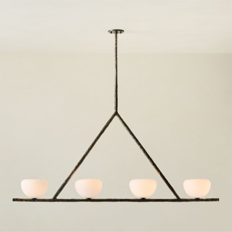 Handblown opaline glass shades float on a bronze-finished frame in the linear pendant by Chicago-based AD100 designer