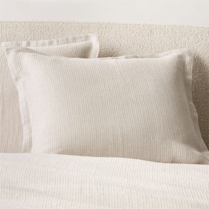 Woven from a luxurious blend of 80% Masters of FLAX FIBRE™-Certified Linen and 20% cotton, pillow shams reveal a quiet rhythm of cool grey stripes stitched on a warm white ground. The natural fibers offer an airy hand and a 1-inch flange adds a polished look. CB2 exclusive.